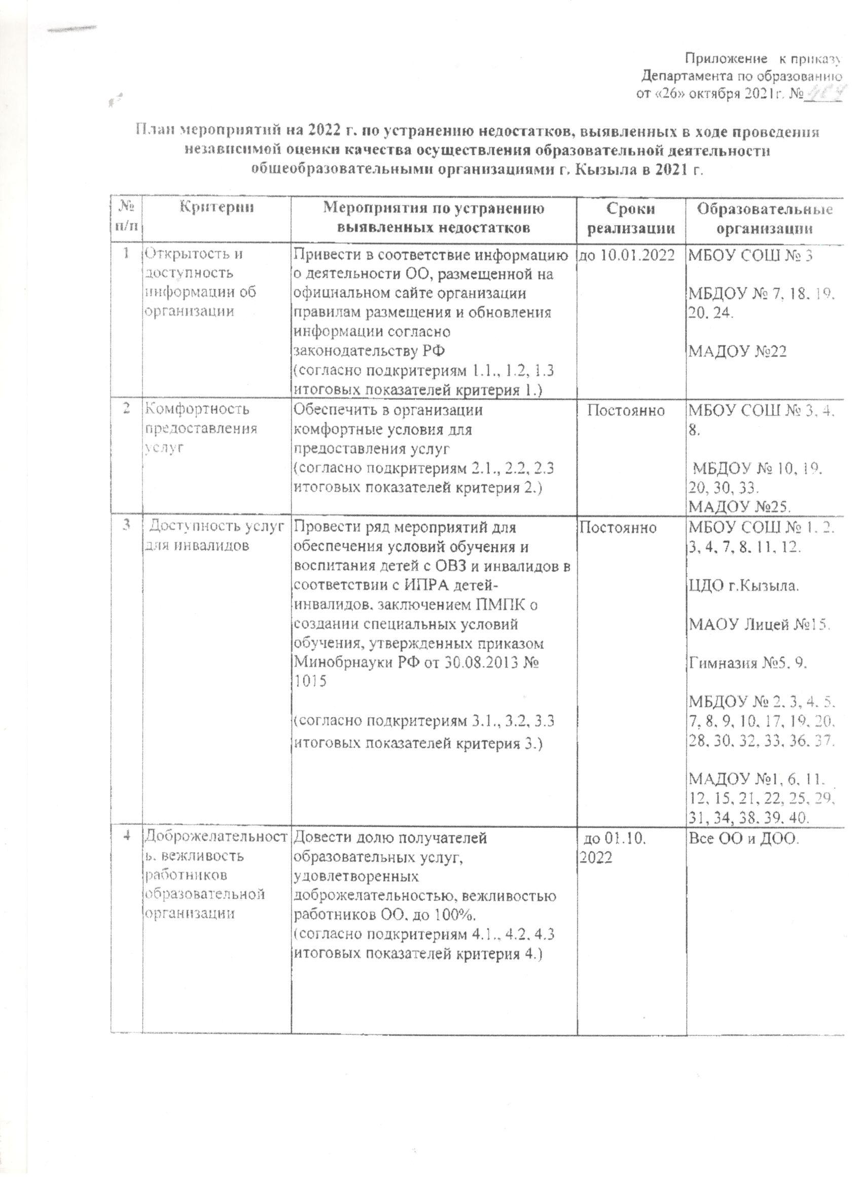 Независимая оценка качества условий осуществления образовательной деятельности организациями проводится по таким общим критериям, как открытость и доступность информации об организациях, осуществляющих образовательную деятельность; комфортность условий, в которых осуществляется образовательная деятельность; доброжелательность, вежливость работников; удовлетворенность условиями ведения образовательной деятельности организаций, а также доступность услуг для инвалидов.
